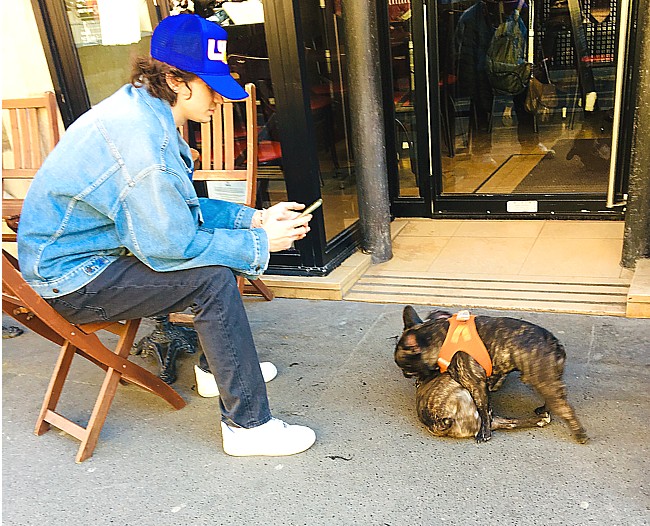 | 無心にたわむれるブルドッグちゃんたち。 飼い主もカッコいい。 |